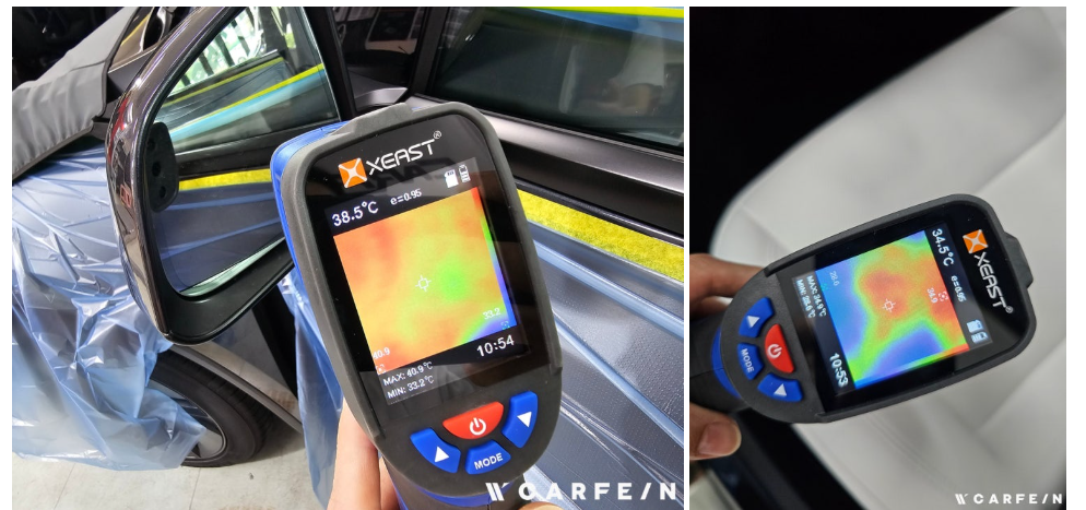 주니퍼 틴팅에 들어가기에 앞서 마스킹 작업을 진행해 주었습니다. 틴팅 작업 중 열성형은 차량 외부에서,