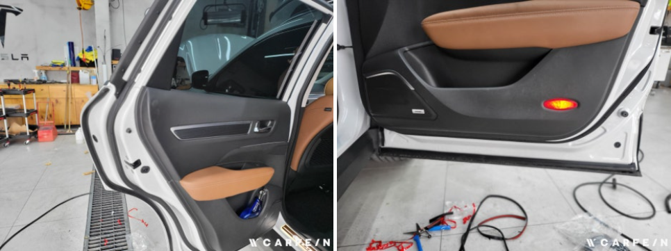 도어 내부에 음재를 추가 시공하는 방법입니다. 방음은 단순히 두껍게 붙인다고 효과가 나는 게 아닙니다. 공기 진동을 흡수하는 재질을 고려해야 합니다.