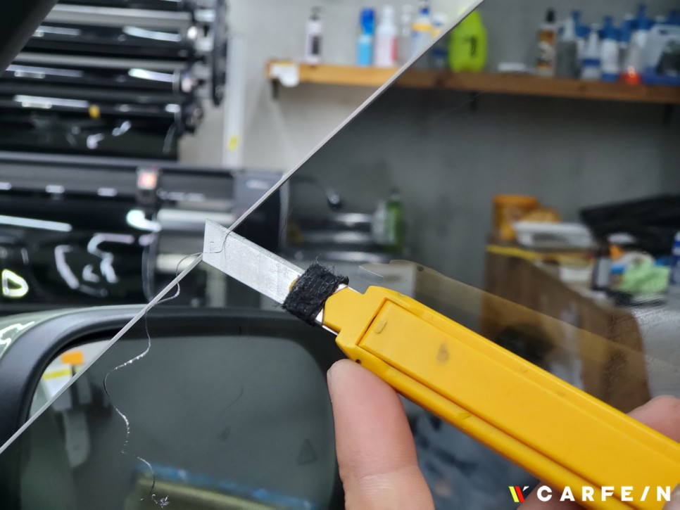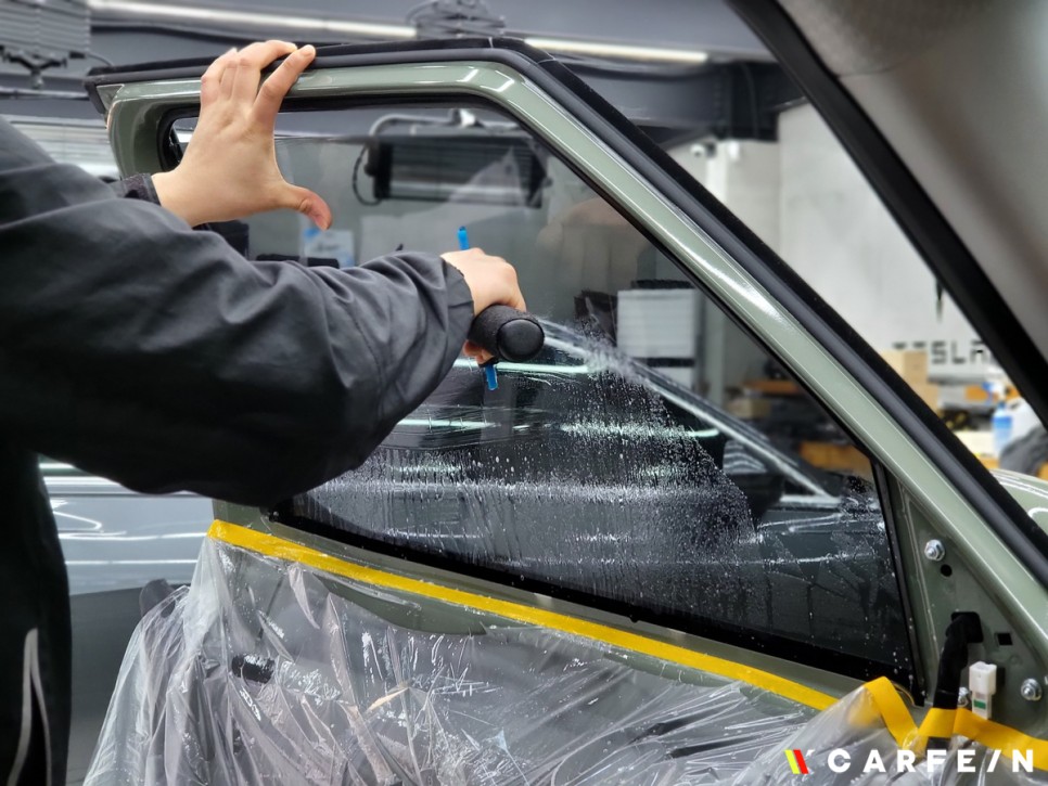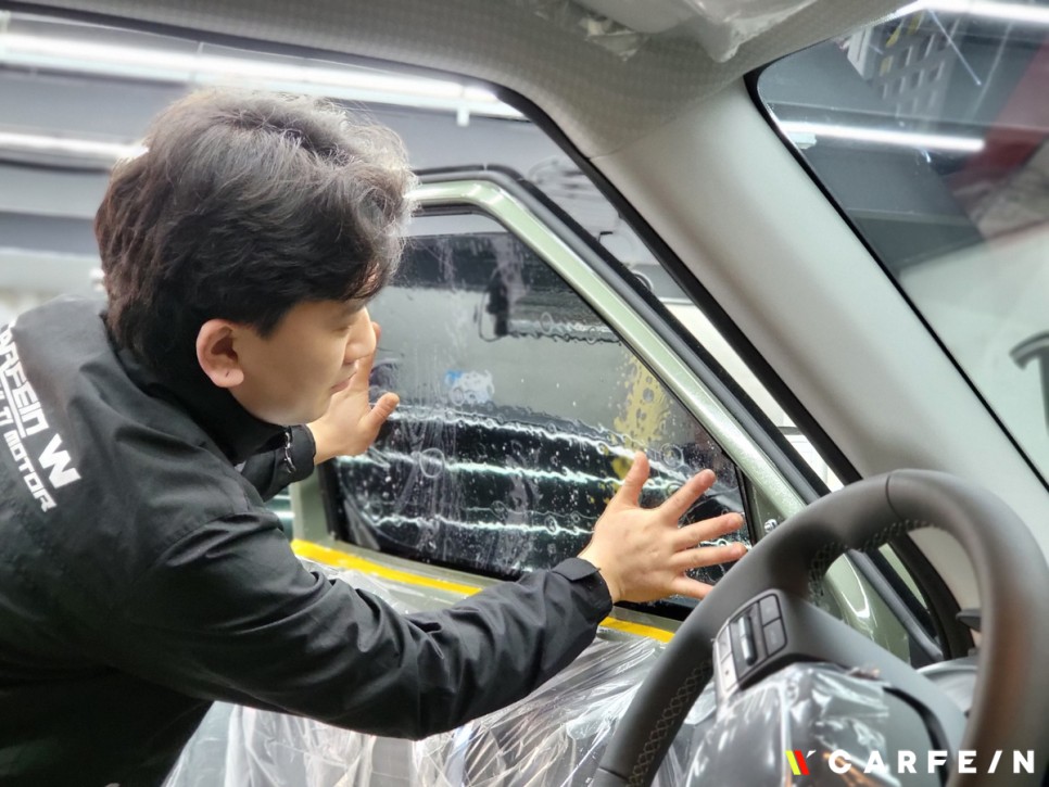 썬팅 전문 작업자가 썬팅 작업에 열중해