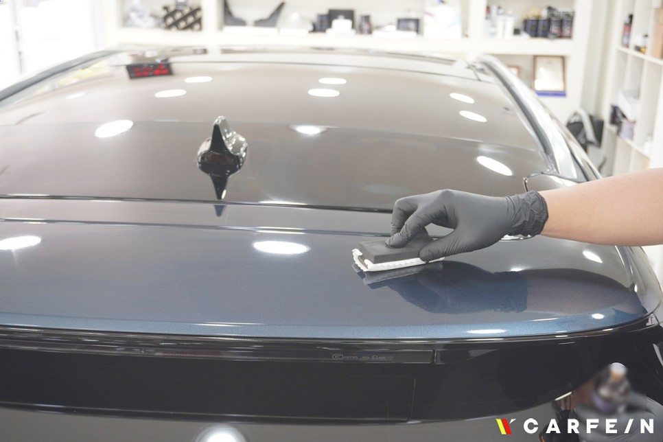 유리막코팅제를 도장면에 올리고 있습니다.