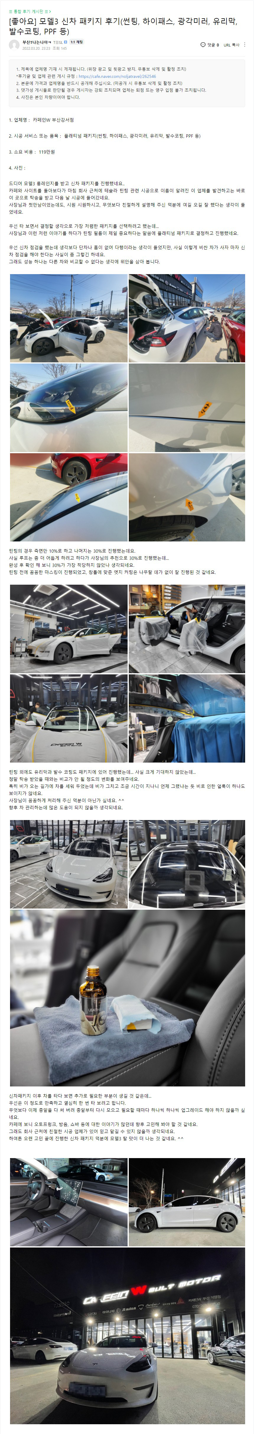 [좋아요] 모델3 신차 패키지 후기(썬팅, 하이패스, 광각미러, 유리막, 발수코팅, PPF 등)