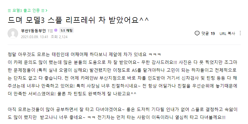 드뎌 모델3 스플 리프레쉬 차 받았어요^^