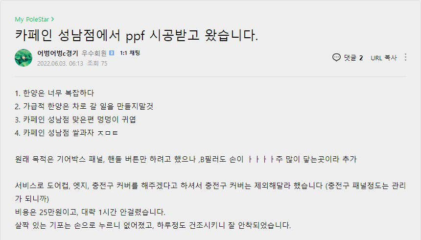 카페인 성남점에서 ppf 시공받고 왔습니다.