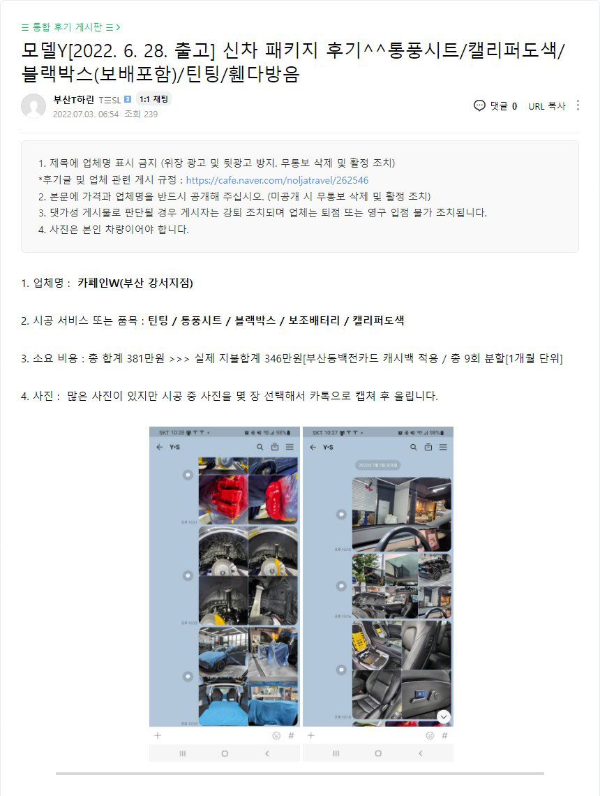 모델Y[2022. 6. 28. 출고] 신차 패키지 후기^^통풍시트/캘리퍼도색/블랙박스(보배포함)/틴팅/휀다방음