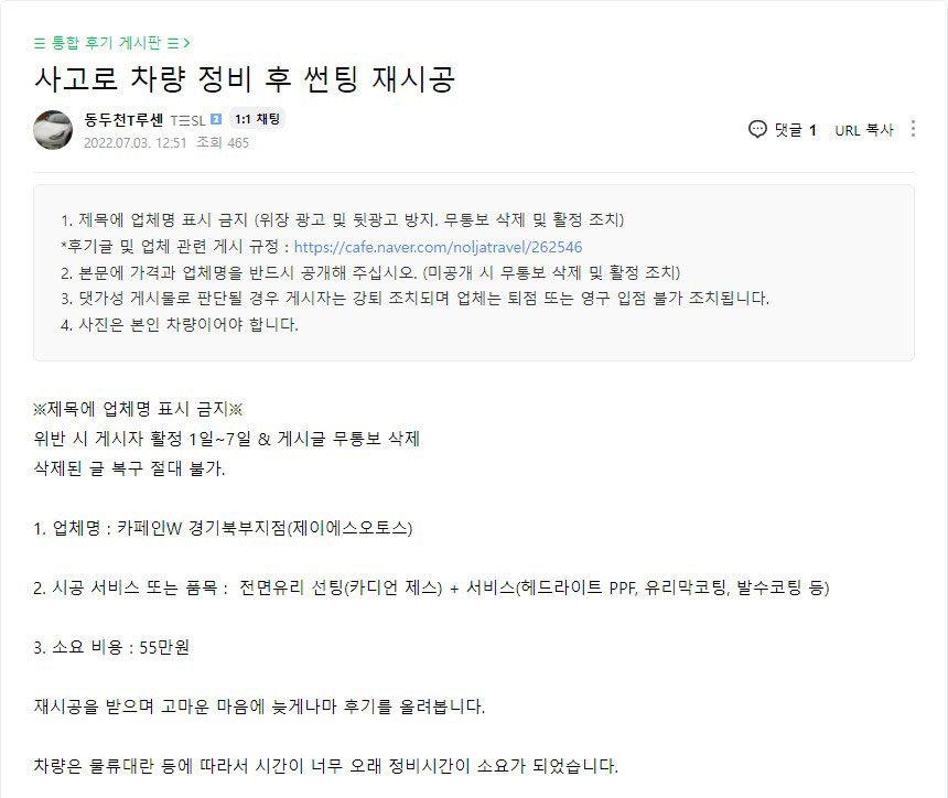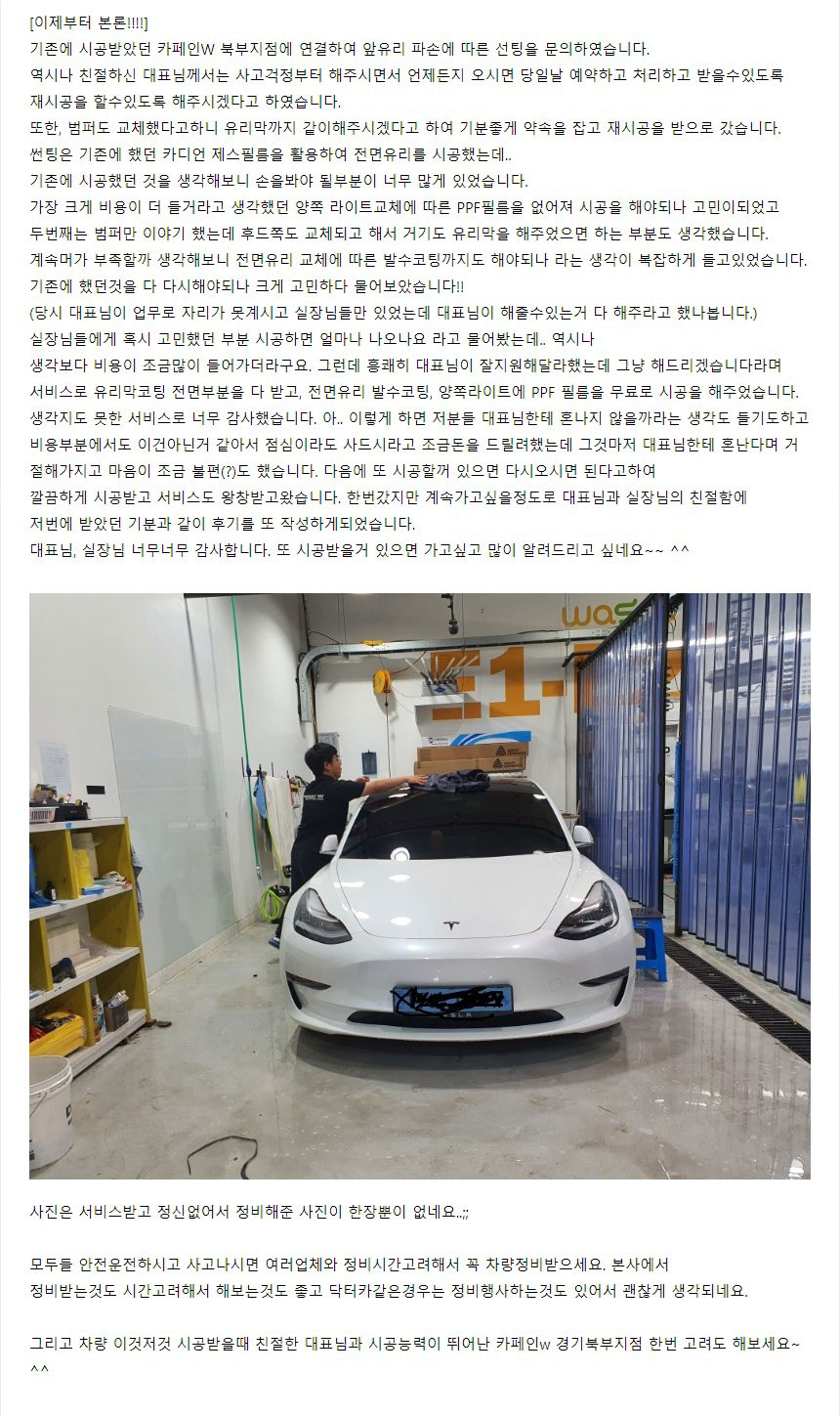 사고로 차량 정비 후 썬팅 재시공
