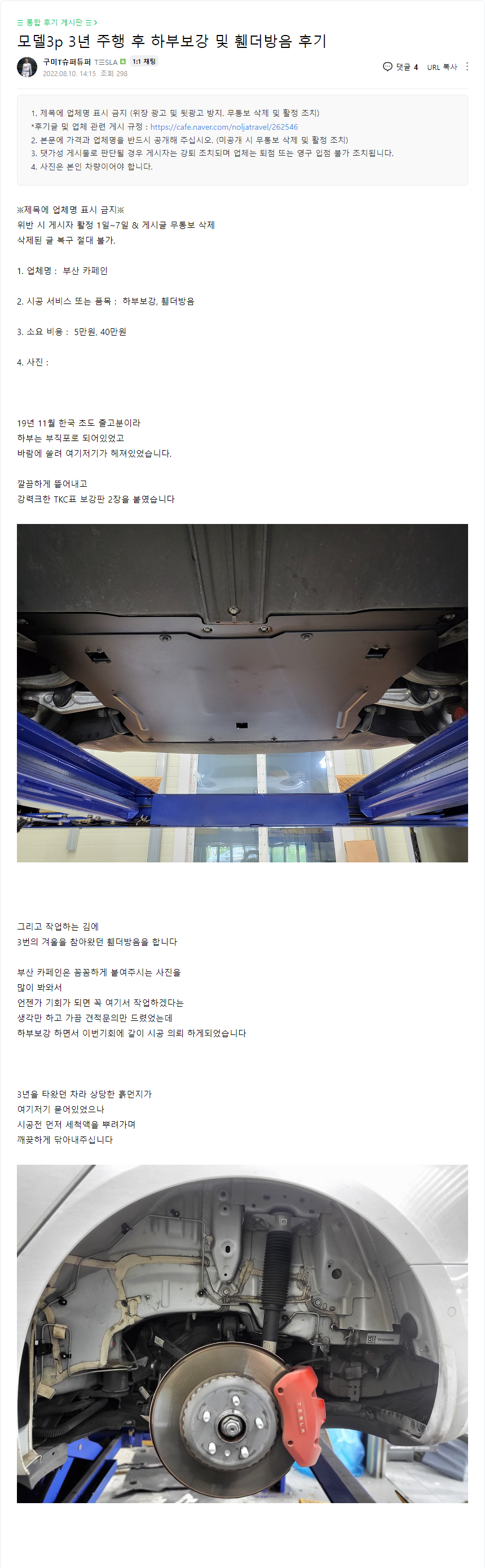 모델3p 3년 주행 후 하부보강 및 휀다방음 후기