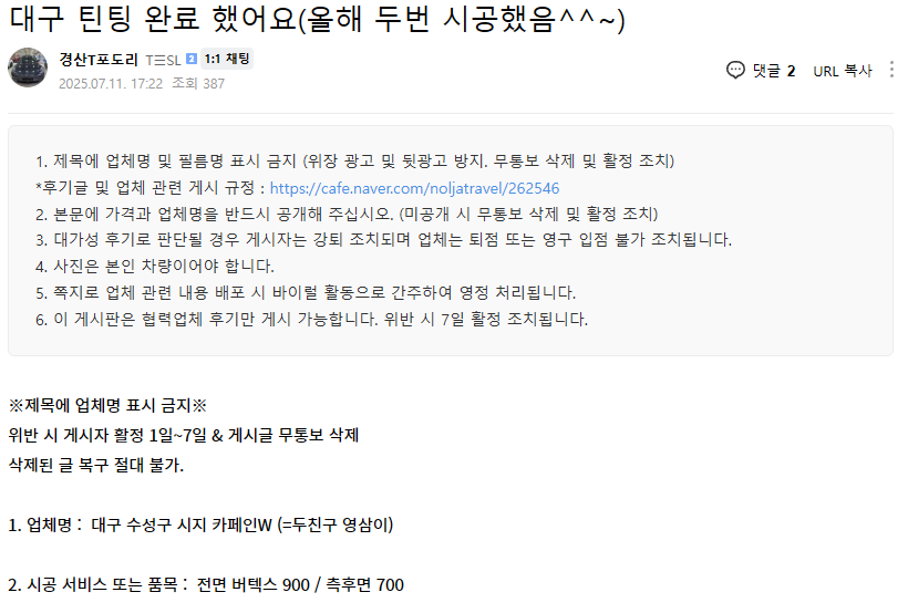 대구 틴팅 완료 했어요 (올해 두번 시공했음^^~)