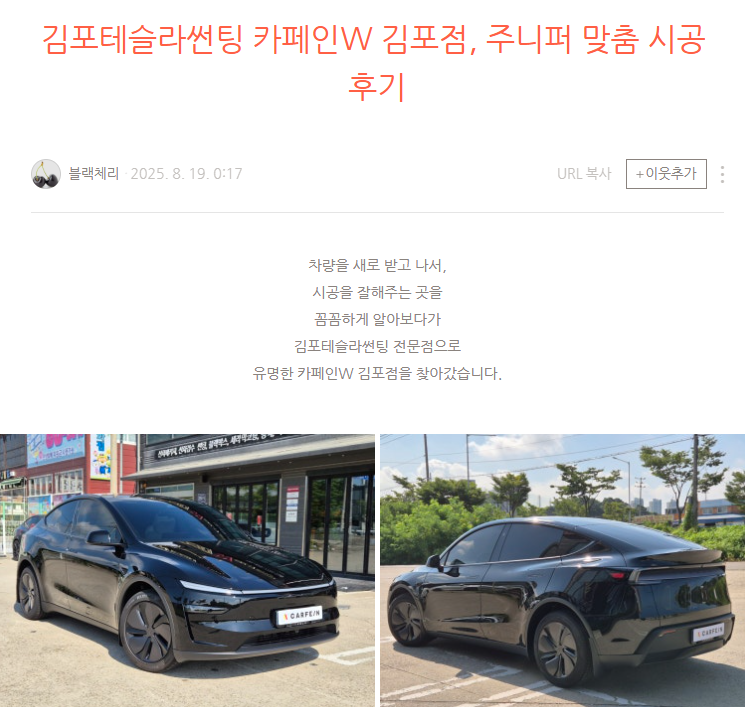 김포 테슬라 썬팅 카페인W 김포점. 주니퍼 맞춤 시공 후기