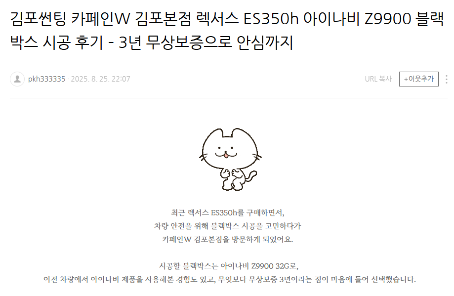 김포썬팅 카페인W 김포본점 렉서스 ES350h 아이나비 Z9900 블랙박스 시공 후기 – 3년 무상보증으로 안심까지