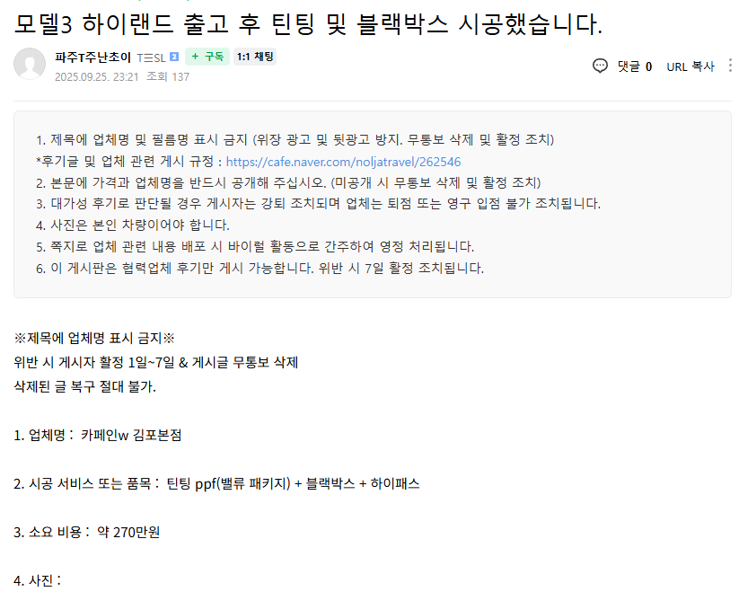모델3 하이랜드 출고 후 틴팅 및 블랙박스 시공했습니다.