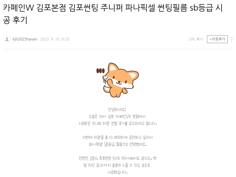 카페인W 김포본점 김포썬팅 주니퍼 파나픽셀 썬팅필름 sb등급 시공 후기