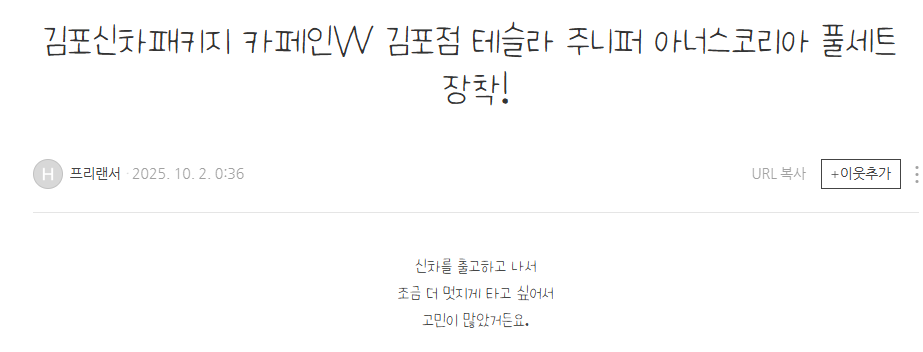 김포신차패키지 카페인W 김포점 테슬라 주니퍼 아너스코리아 풀세트 장착!
