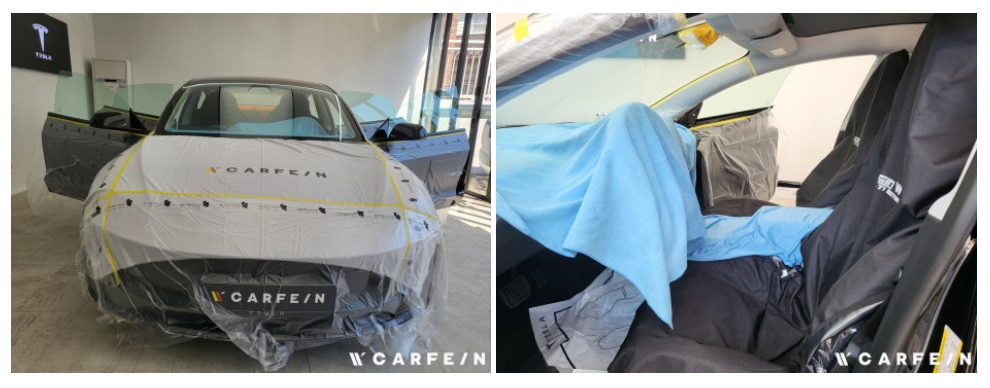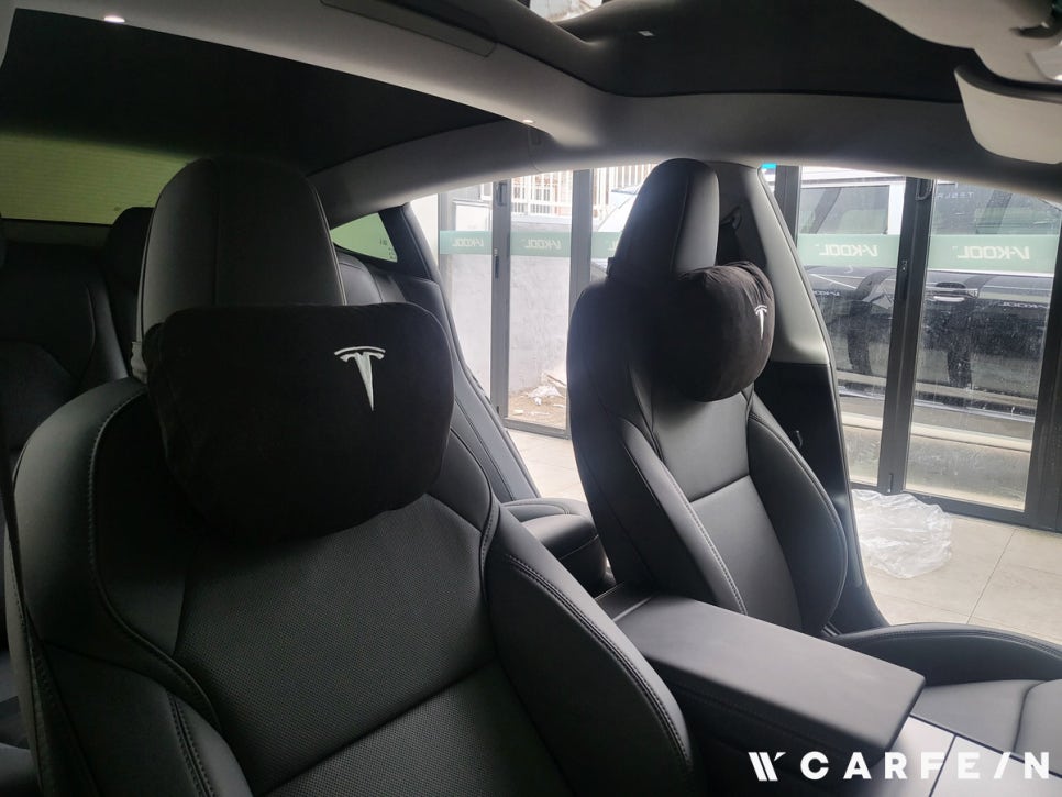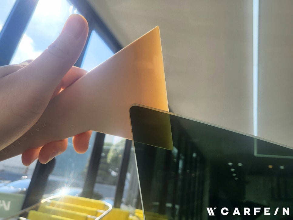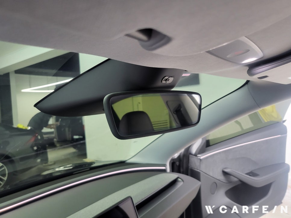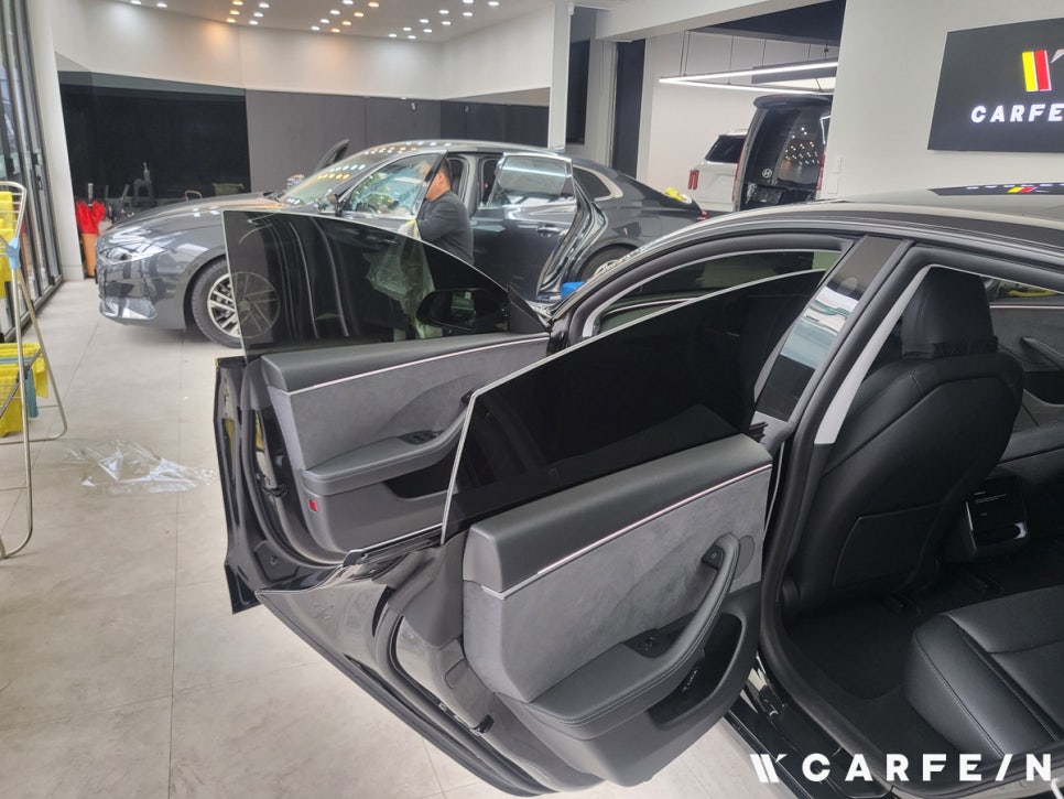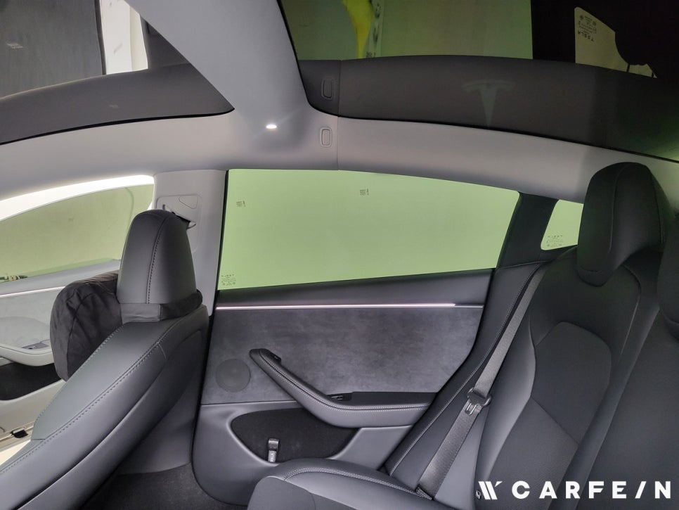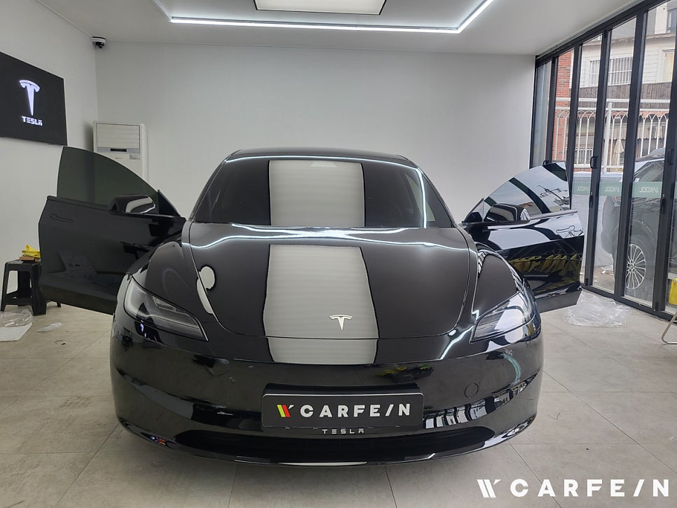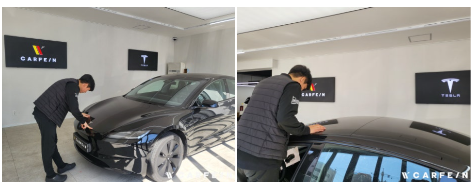 테슬라 하이랜드 루프와 전면 유리는 곡률이 커서 필름 시공이 까다롭습니다.