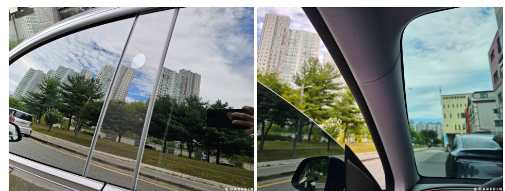 위, 아래 사진을 보시면 밖에서는 차량 내부가 잘 보이지 않지만 안에서 밖을 보는 시안성은 정말 뛰어난 것을 볼 수 있습니다.
