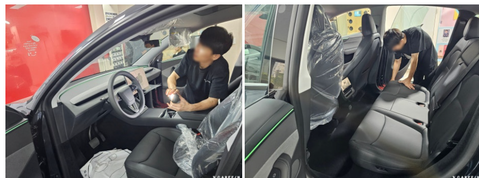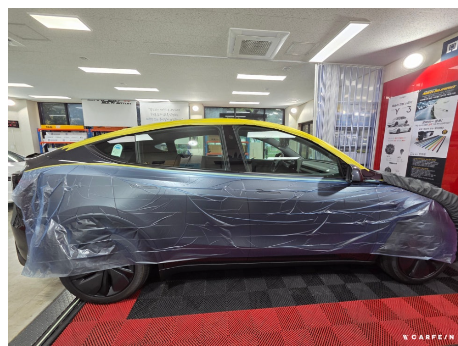 테슬라 주니퍼 차량의 앞, 뒤 양옆, 내부까지 마스킹을 끝내면 드디어 썬팅을 시작할 수 있습니다.