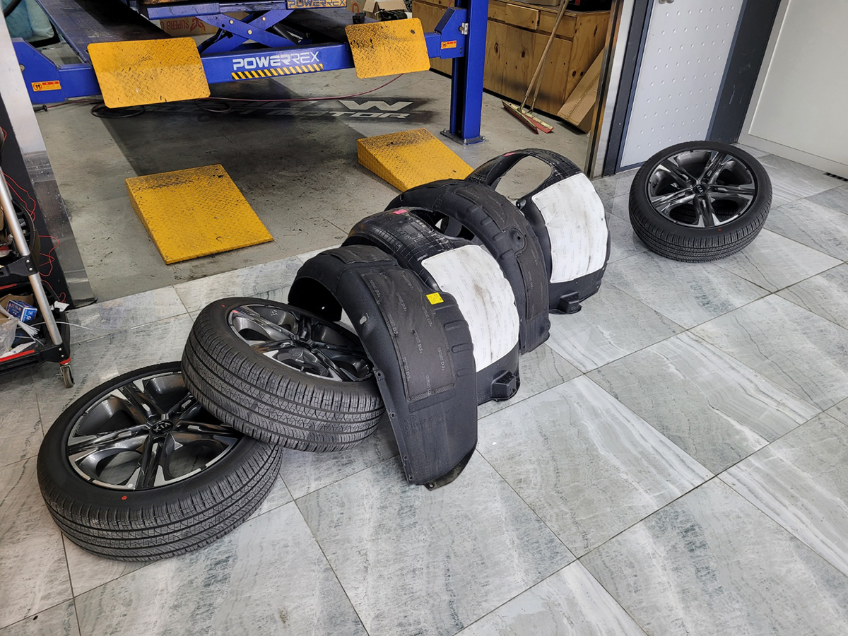 작업을 진행하느라 탈거한 휀다커버, 휠타이어를