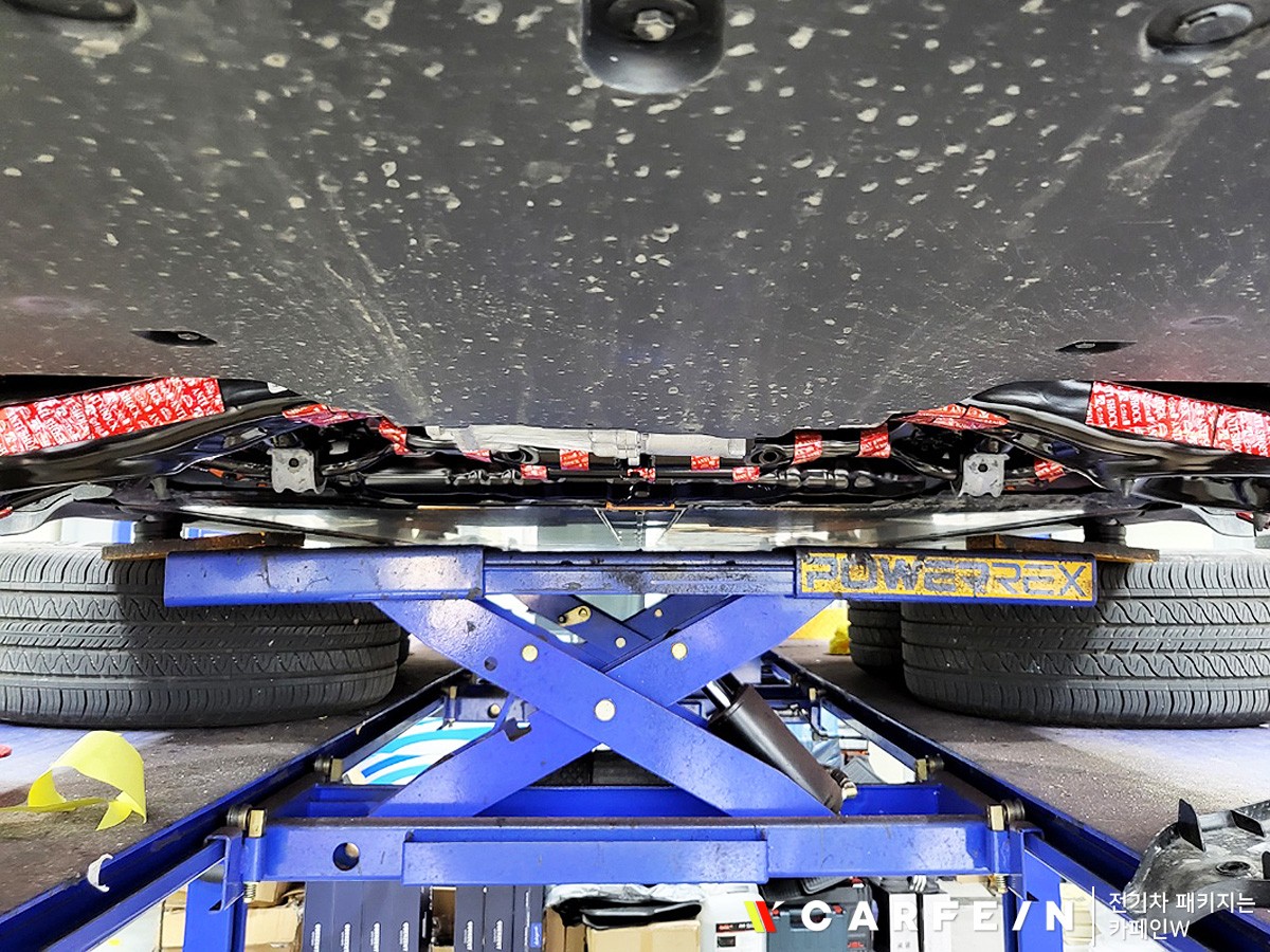 테슬라 모델Y 차량을 리프트에 올려