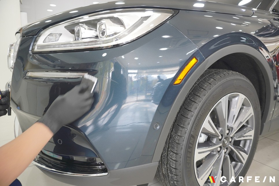 유리막코팅제를 도장면에 올리고 있습니다.