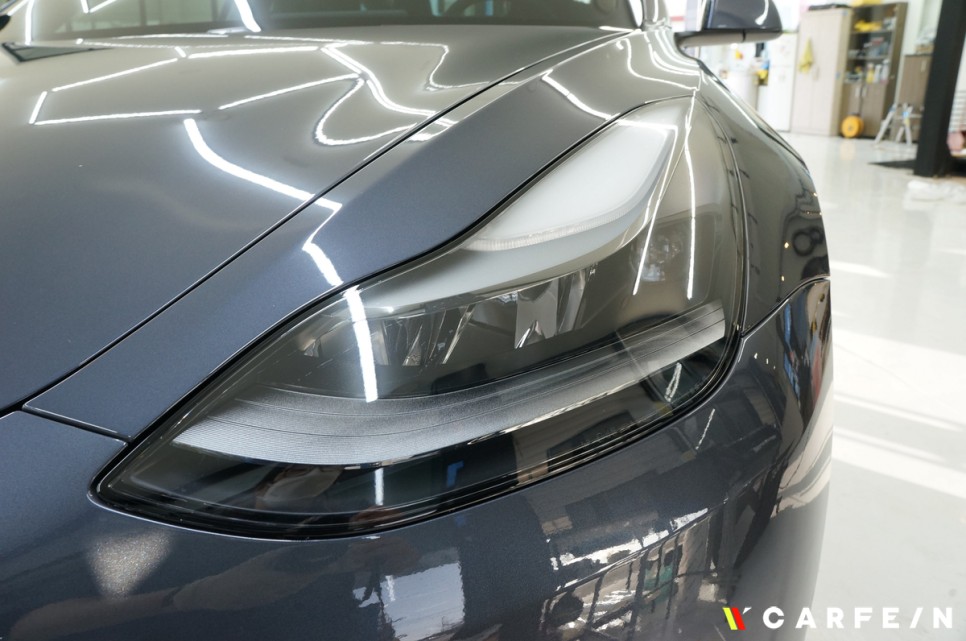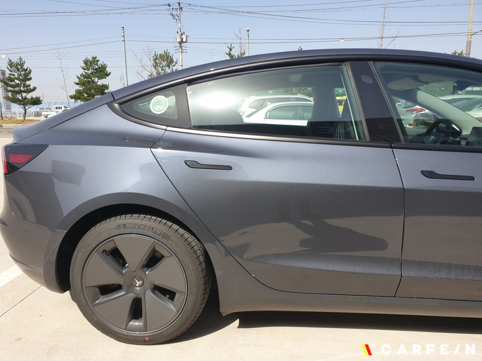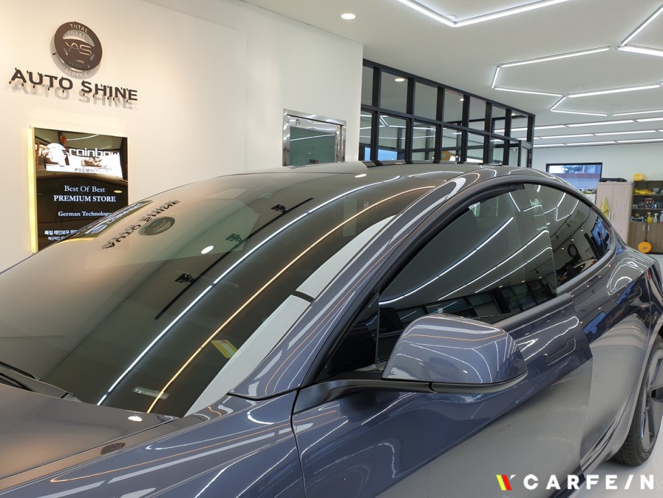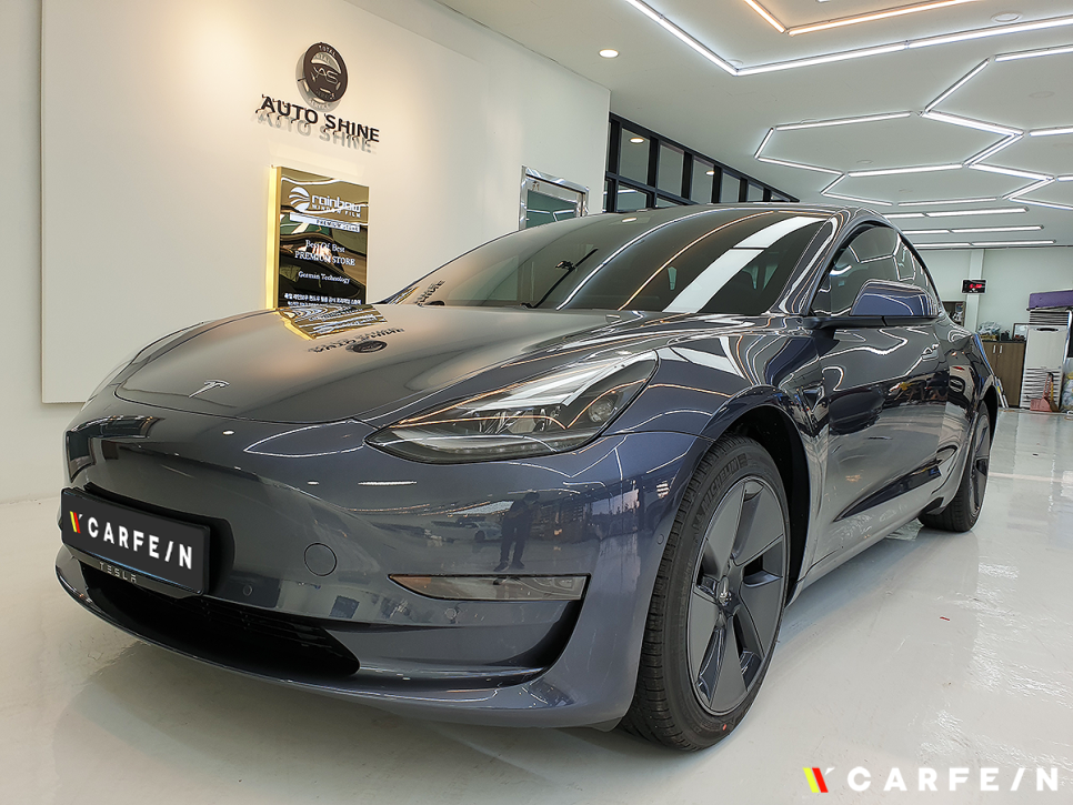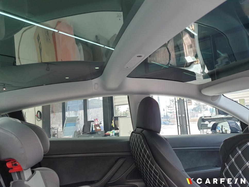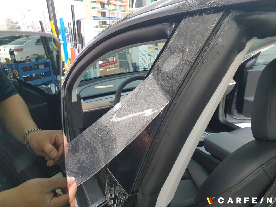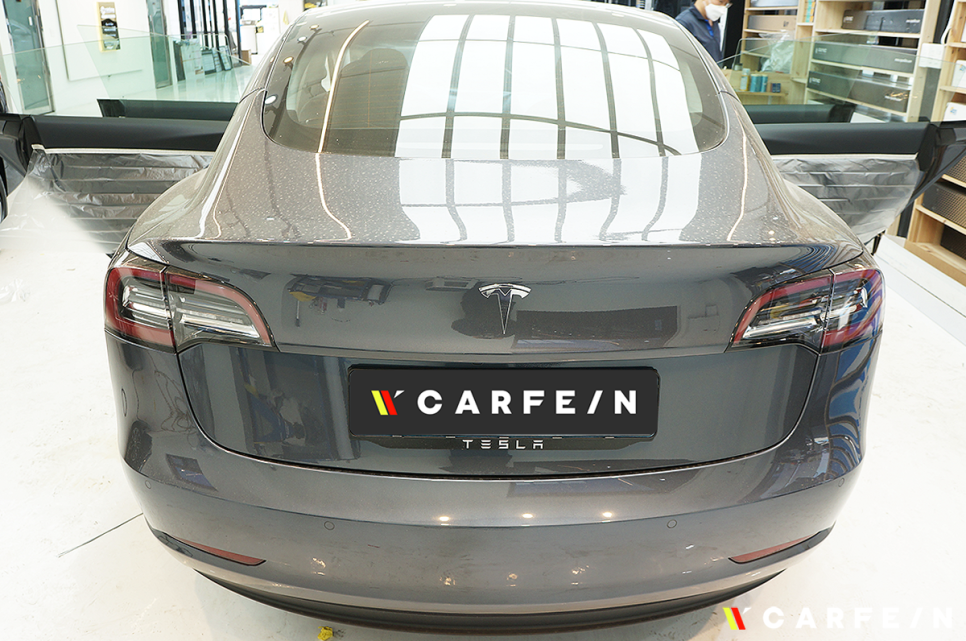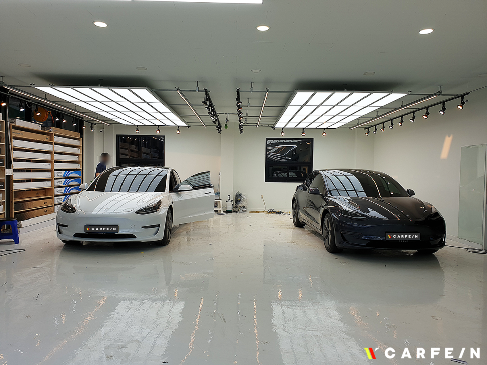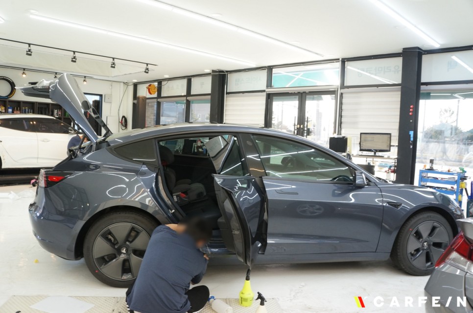 모델3 차량의 실내외 모두 마스킹 및 테이핑