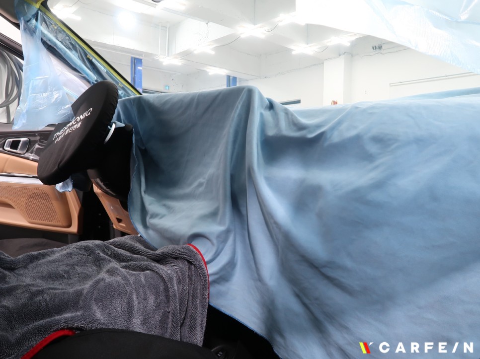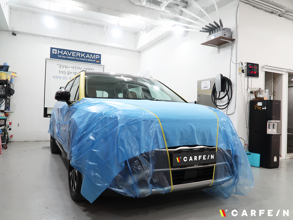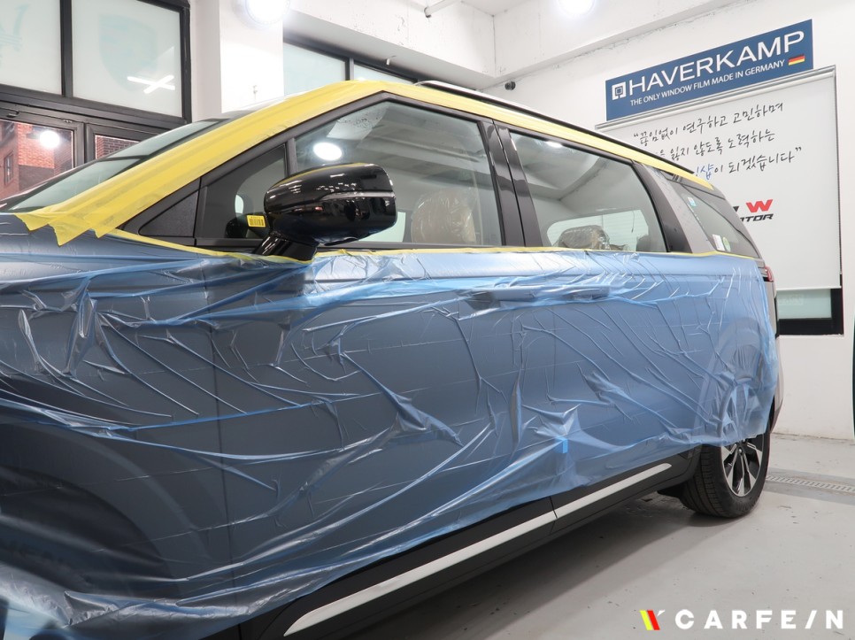 비닐과 천을 이용해 전체 커버링하여 차량 외부