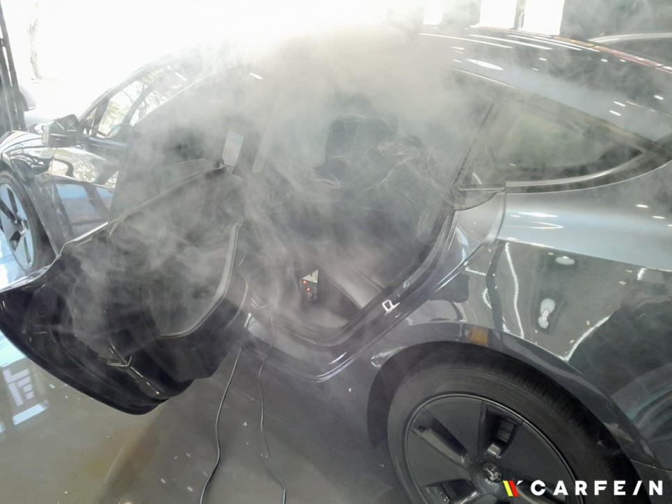 작업을 위해서 시공 중 전기차 테슬라 차량에