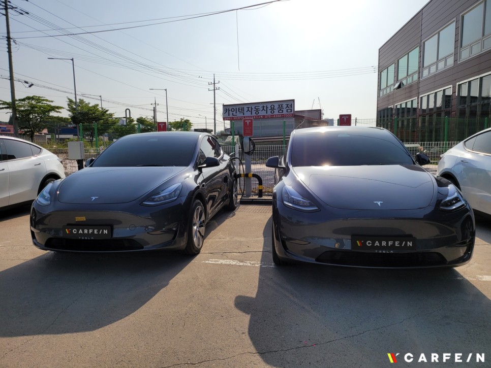(왼) 모델3 신차패키지 완료 차량 / (우) 모델Y 썬팅 완료 차량