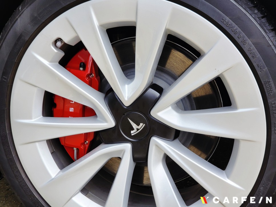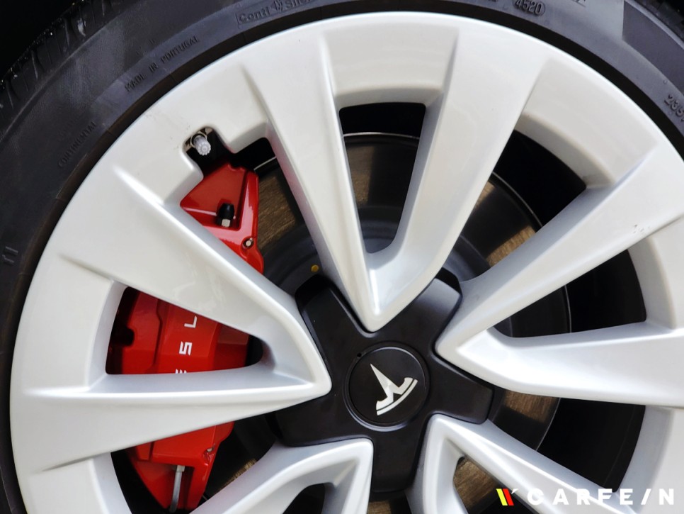 휠 사이로 쨍한 레드 컬러의 캘리퍼가